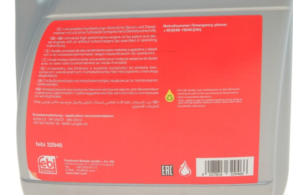 Масло моторное SAE 5W-30 Longlife Plus 4L FEBI BILSTEIN 32946