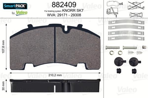 Тормозные колодки 210,2 x107, 8x30 без поперечной пластины Valeo 882409